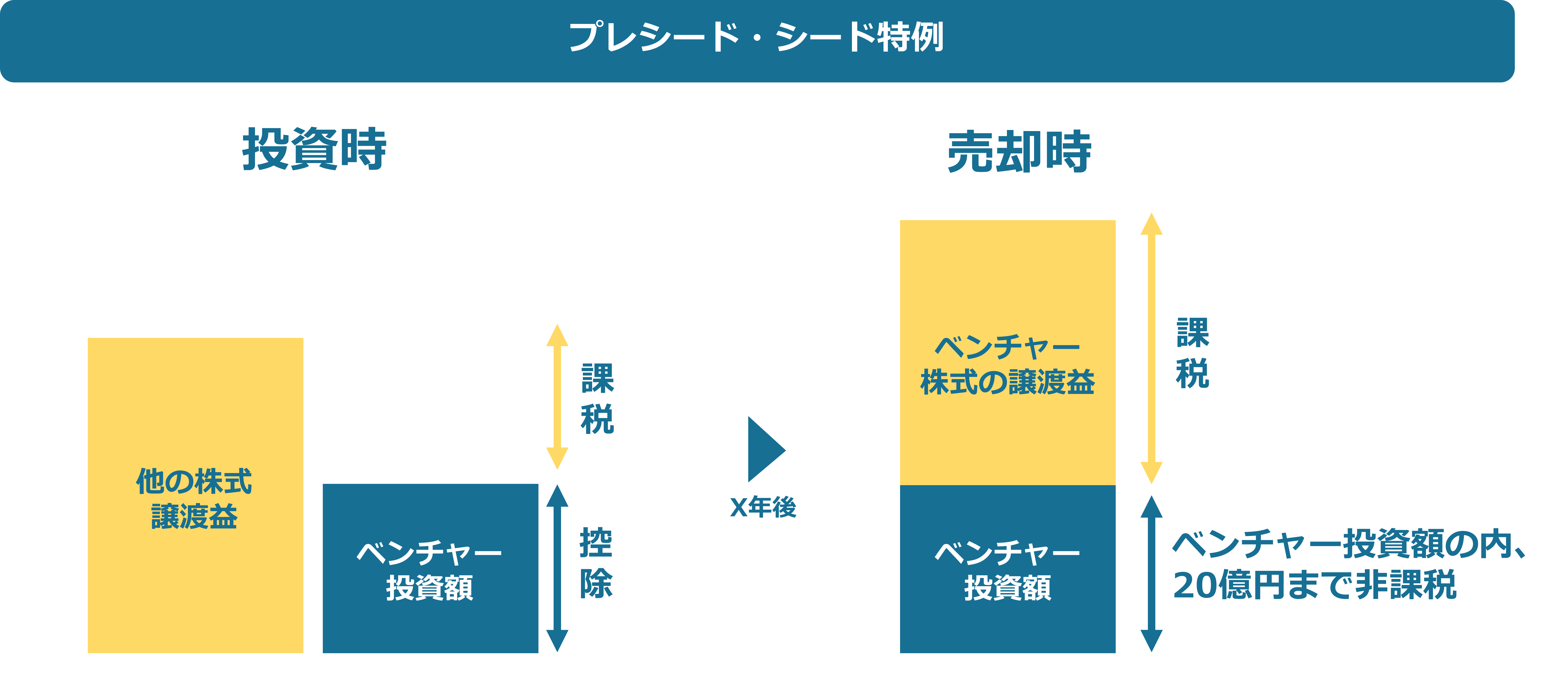 対して、プレシード・シード特例対象の企業の場合、投資時で課税されなかった投資額が20億円までは非課税となります。