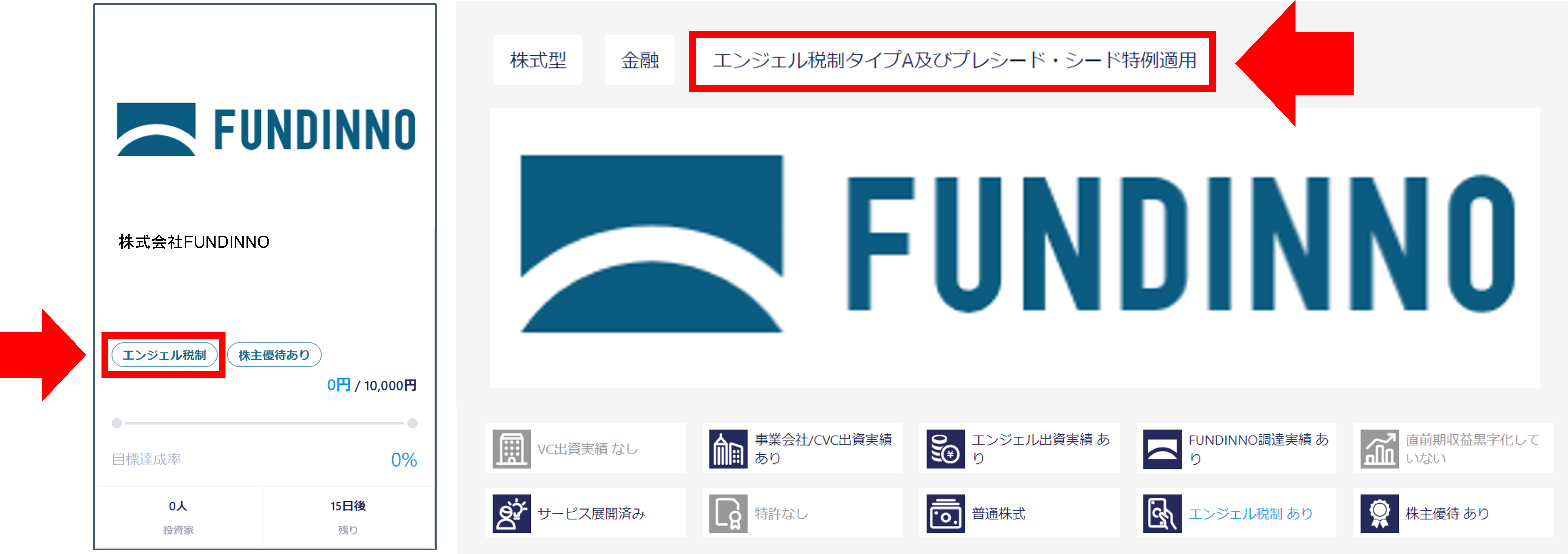 「エンジェル税制」と記載のあるプロジェクトをクリックしたのち、「エンジェル税制タイプ」をご覧ください。