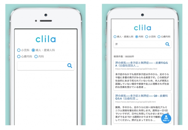 clilaはアナムネの登録医師が監修し、医学系学会と病院、クリニックのページのみのデータベースから検索結果を表示するなど