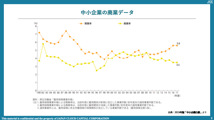 2019年版 中小企業白書で公開されている廃業率(本レポートでは倒産リスクという)が2017年は3.5%。なお経産省より公開されているデータだと、事業所といった小さな規模の会社も含めると、2016年度の値が15%である⁴。