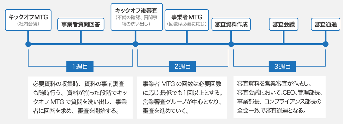 FUNDINNOの審査とは、二段階のチェック機能を備えた厳正な審査である。審査資料に基づいて審査グループが中心となって審査を進め、審査会議において内部管理統括責任者、コンプライアンス部長、広告審査部長の全員一致で審査通過となる。その後、案件化され、FUNDINNOのプラットフォームに掲載されるが、目標募集額に到達しない案件は投資実行が行われない。FUNDINNOによる適切な審査を通過した後は、投資家の集合知による“審査”を通過しなければならないのである。