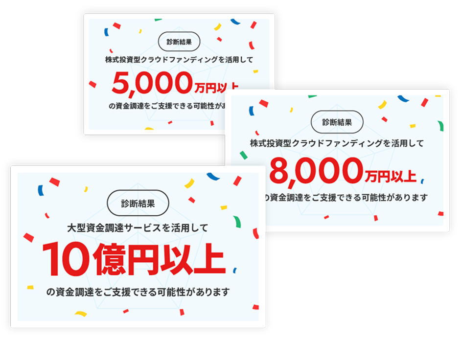 資金調達診断の結果は参考情報として提供するものであり、資金調達の実現や調達金額を保証・約束するものではありません。