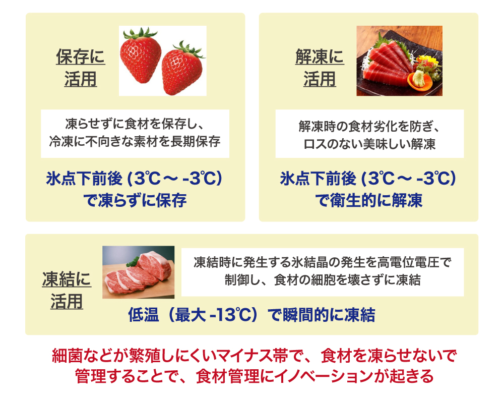 ããã«ãããä»ãŸã§å·èµåº«ã§ç®¡çããŠã鮮床èœã¡ãæ©ãã£ã飿ããåããããšè³ªãèœã¡ãŠããŸãæ§ãªé£æã§ãã0âååŸã®æž©åºŠç°å¢äžã§ãé«å質ããé·æéãä¿åããããšãå¯èœã«ãªããŸãããããŠãããããé£æã«æéããäžããããšã«ç¹ããã®ã§ãã