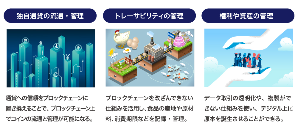 2008年ごろに誕生したブロックチェーン技術は世界中から「インターネットの次の画期的な技術」として注目を集めています。ブロックチェーン技術は、「記録の透明性」「改ざんが困難」「スマートコントラクト(第三者機関がいなくても契約状況の把握ができる仕組み)」といった特徴を持っていることから、「資産の安全な取引」を求める金融領域をはじめとして普及が進んでいます。