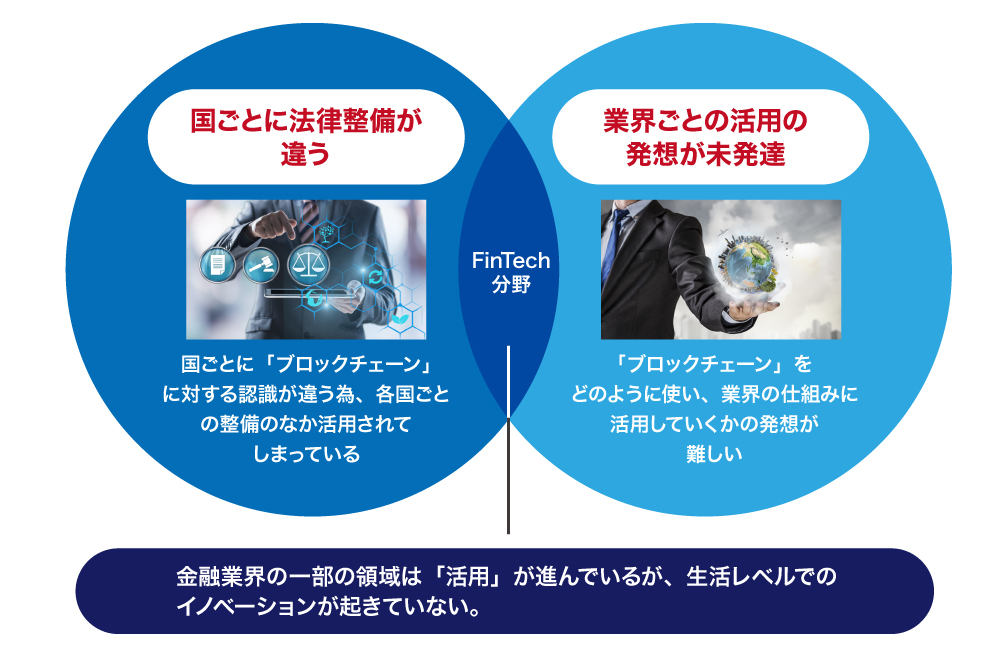 そんな、次世代の情報管理の仕組みを持つブロックチェーン技術ですが、ユースケースが海外中心であったり、法律が国ごとに違う為、他国のサービスが自国で使えないなど、活用がまだまだ進んでいません。また、業界ごとの慣習に合わせて、どの様に活用していくかの発想の切り替えも難しい部分があります。
