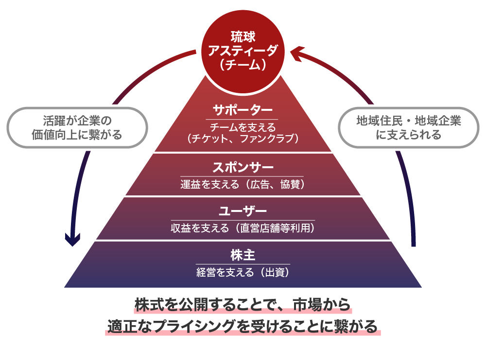 また、今まで日本でのプロスポーツチームの経営は、大規模資本による企業PRやCSRへの活用による運営イメージが強かったのですが、弊社は国内初となるプロスポーツチームの上場を目指しています。それにより、ファン株主を中心としたチーム運営、また、地域に根ざした循環型のチーム運営の仕組みを創り、「日本における新たなスポーツビジネスのあり方」の創出を目指します。