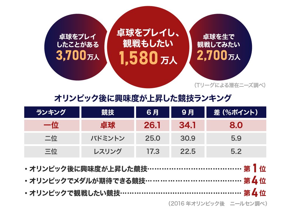 近年、日本における卓球へのイメージは、有名選手の誕生や、2016年のリオ五輪でのメダルラッシュなどをきっかけに、認知・興味度が向上し、メジャーでかっこいいスポーツとして確立しました。また、2020年の東京オリンピックに向けても注目を集めるなど、今、日本で最も“アツい“スポーツになっていると考えています。