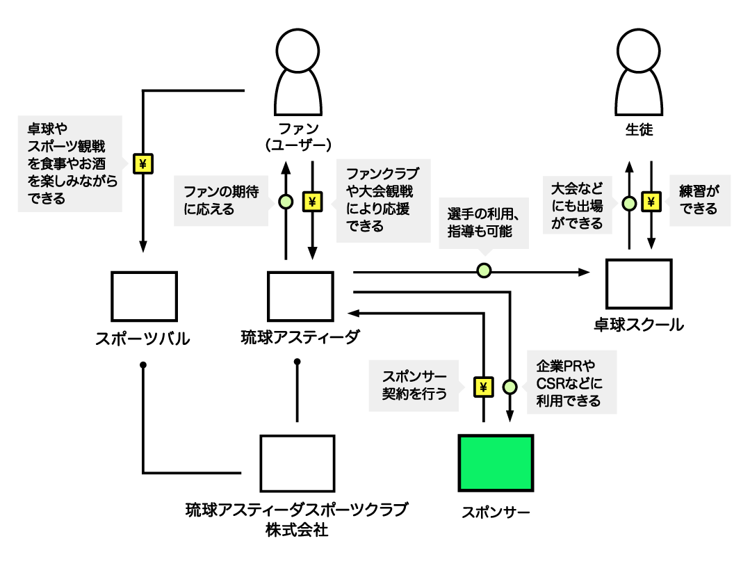 マネタイズに関しては、「琉球アスティーダ」へのスポンサーフィー、弊社運営のスポーツバルの売り上げおよび、フランチャイズ加盟料、また、卓球スクールの運営により行ってまいります。
