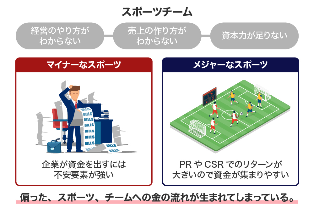 結果、選手がバイトなどをしながら活動資金を稼がなければならなかったり、大規模資本から企業のPRやCSR目的での出資は、メジャースポーツにのみ集中するといった「強いもの、強い地域」だけが活躍できてしまう状況が発生しています。