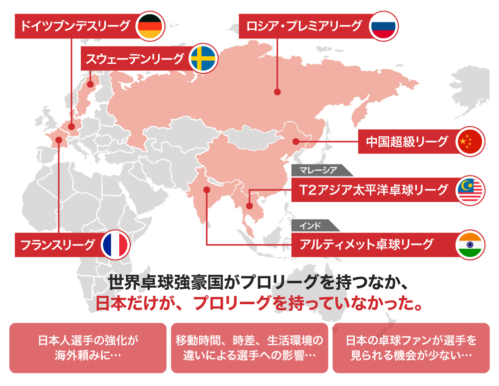 世界からみても日本は強豪国ですが、今まで日本には「プロリーグ」が存在せず、日本人選手の強化の場が海外に流れていました。それにより、海外頼りの選手育成や、ファンが選手の試合を気軽に見にいけないといった環境になっていました。