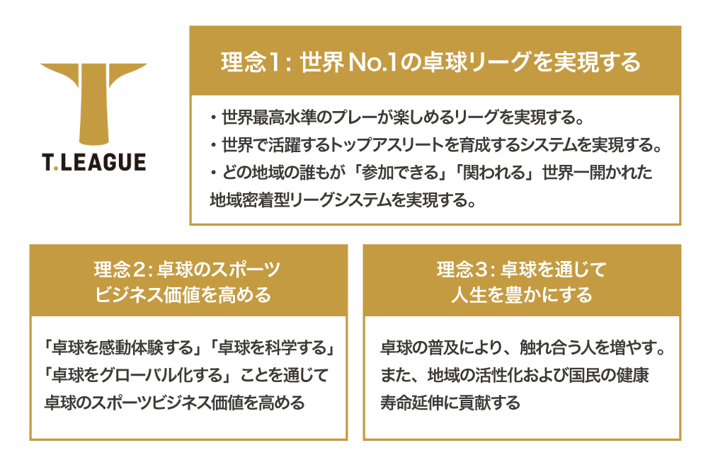 「Tリーグ」は、「世界No.1の卓球リーグを実現する」という理念のもと、プロ・アマの区別なく誰もが参加できる、世界一開かれたリーグにすることを目標に掲げています。