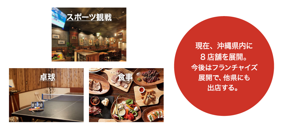 その一環として、現在、沖縄県内に8店舗のスポーツバルを展開しています。当バルでは、食事を楽しめるだけでなく、卓球をしたり、琉球アスティーダの試合観戦をはじめとした、スポーツ中継が楽しめます。