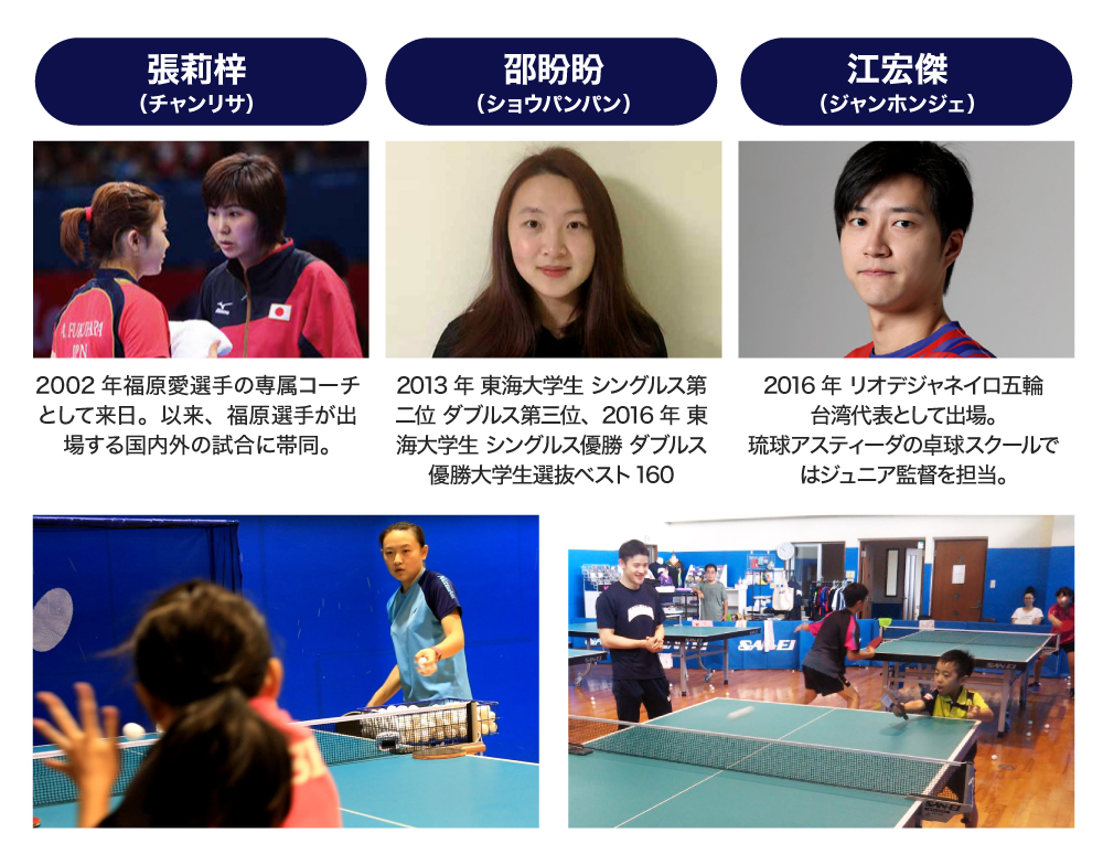 また、弊社が運営する卓球スクールでは、世界で活躍していた一流コーチや、琉球アスティーダの選手から指導を受けることができます。沖縄から、Tリーグや世界を目指すジュニアクラスでは、小学生から高校生まで、多くの子供たちが日々練習に取り組んでいます。