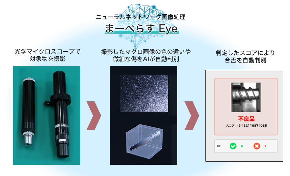 これにより、「まーべらす Eye」を導入された事業者さまは、検査を繰り返すことで独自の学習データを蓄積し、ビッグデータ化して活かすことでより効率よく製品を製造することが可能になります。