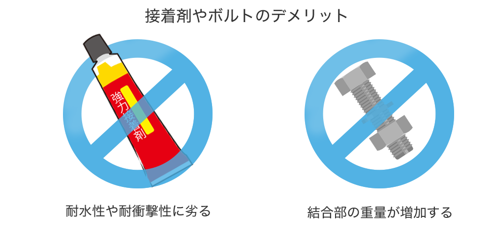 そこで考えられるのが部分最適を図りながら軽量化を実現するという「部品の複合化」という考え方です。しかし、今までの主流である接着剤やボルト締結ではコストや強度、腐食等の課題があり中々実用化されません。