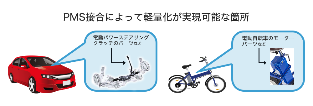 このように低コストで様々な用途に使える「PMS接合」は現在、次世代自動車の電動パワーステアリングのシャフト部分や電動自転車のモーター部分の軽量化に向け試験導入をされており、2020年代中期の本格導入を目指します。