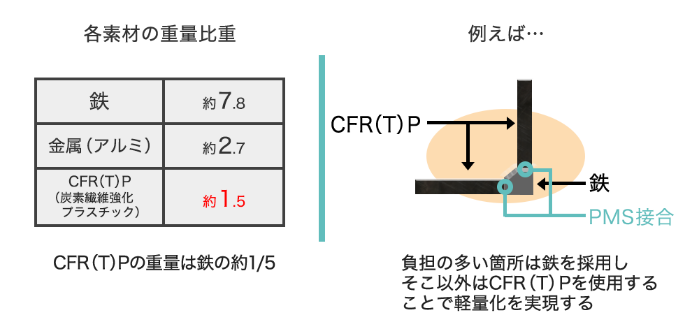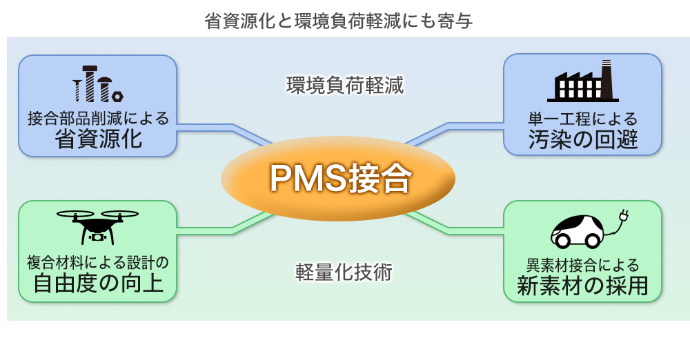 そこで、弊社が独自開発した「PMS接合」(異種材料接合技術)であれば、金属と合成樹脂等を直接接合し、車体の軽量化はもちろん、強度の維持や耐食性、低コスト化も実現することができます。