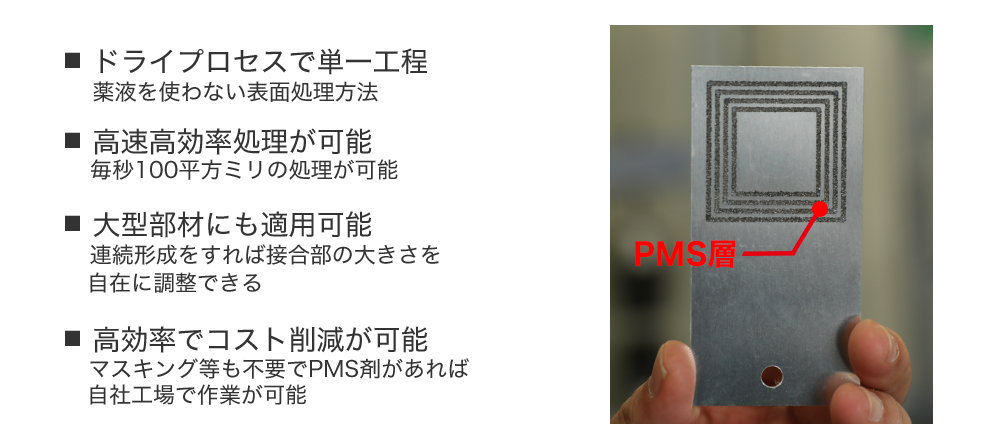 これは、車や工業用機械など、今まで金属だけで作られていたモノの「軽量化」に応えるもので、PMS処理という特殊技術は特許も取得した世界でも唯一の技術です。