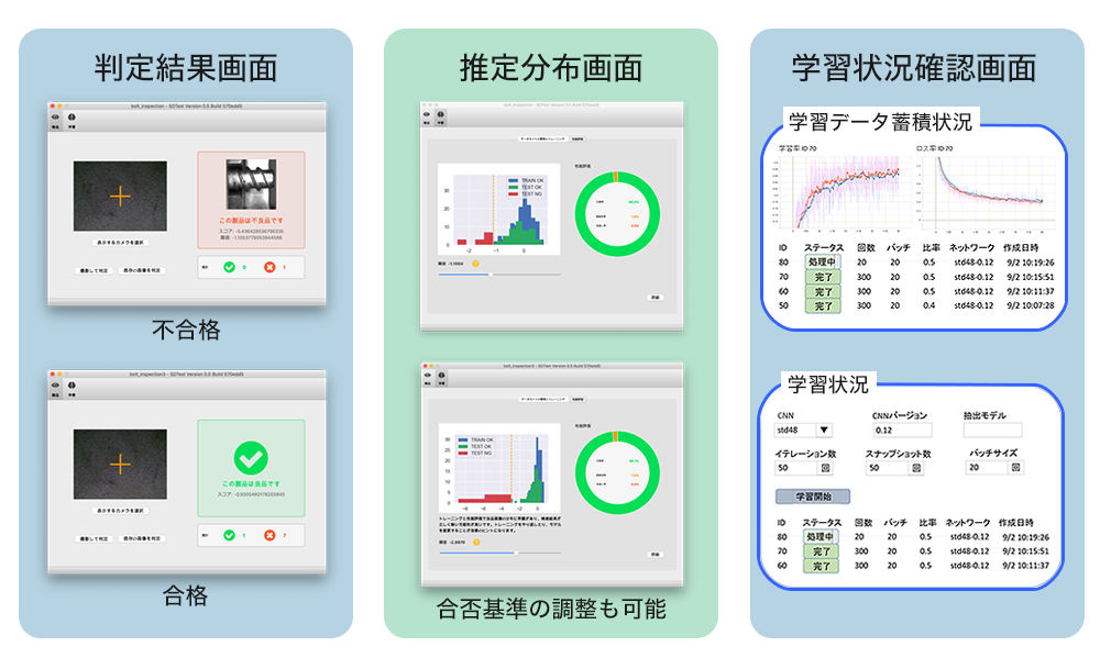 そこから対象の良品及び不良品、それぞれ数個のサンプル数からディープラーニングにより学習を行います。各階層は検査対象により、例えば色識別では色空間とヒストグラムを生成して識別精度を高めています。