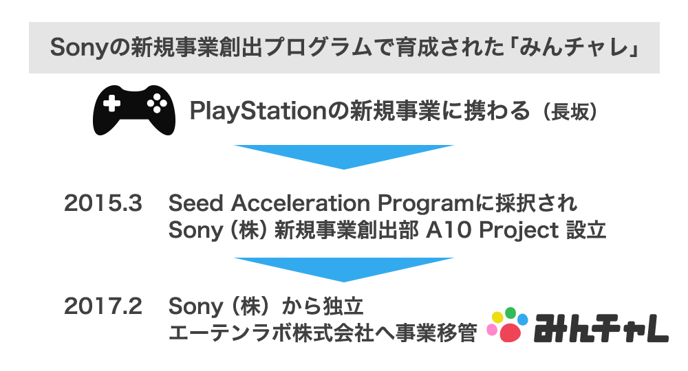 「みんチャレ」は、弊社代表長坂の前職Sony時代における新規事業創出プログラム「Seed Acceleration Program」から生まれたアプリケーションです。(詳しくはコチラ Sony公式HP)