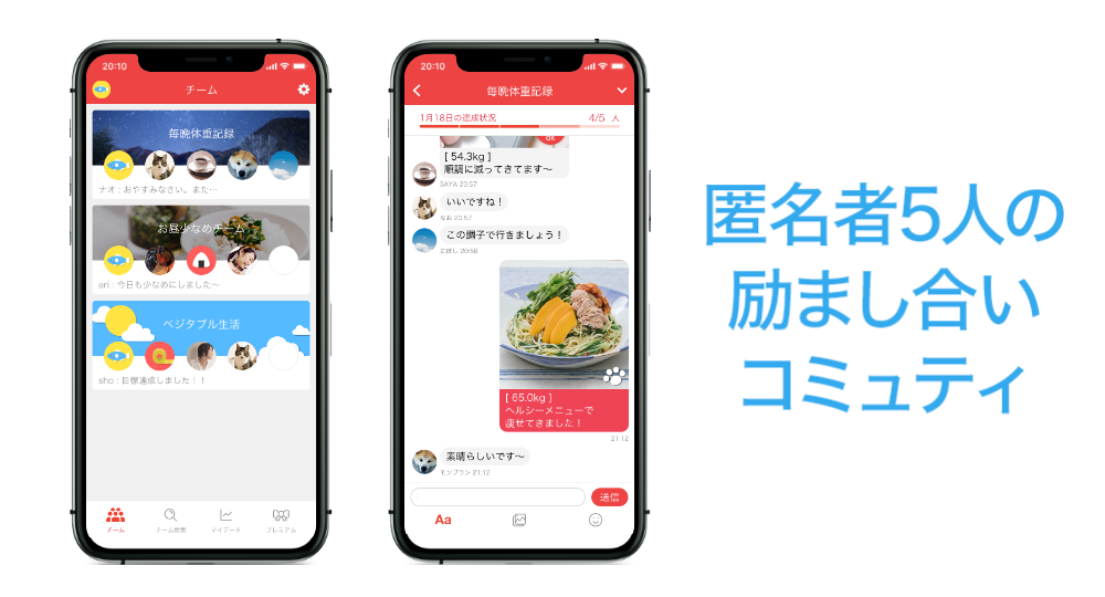 「みんチャレ」はスマートフォン向けのアプリケーションです。アプリの中で「糖尿病改善」「ダイエット」など同じ目標を持つ匿名5人のチームに参加します。