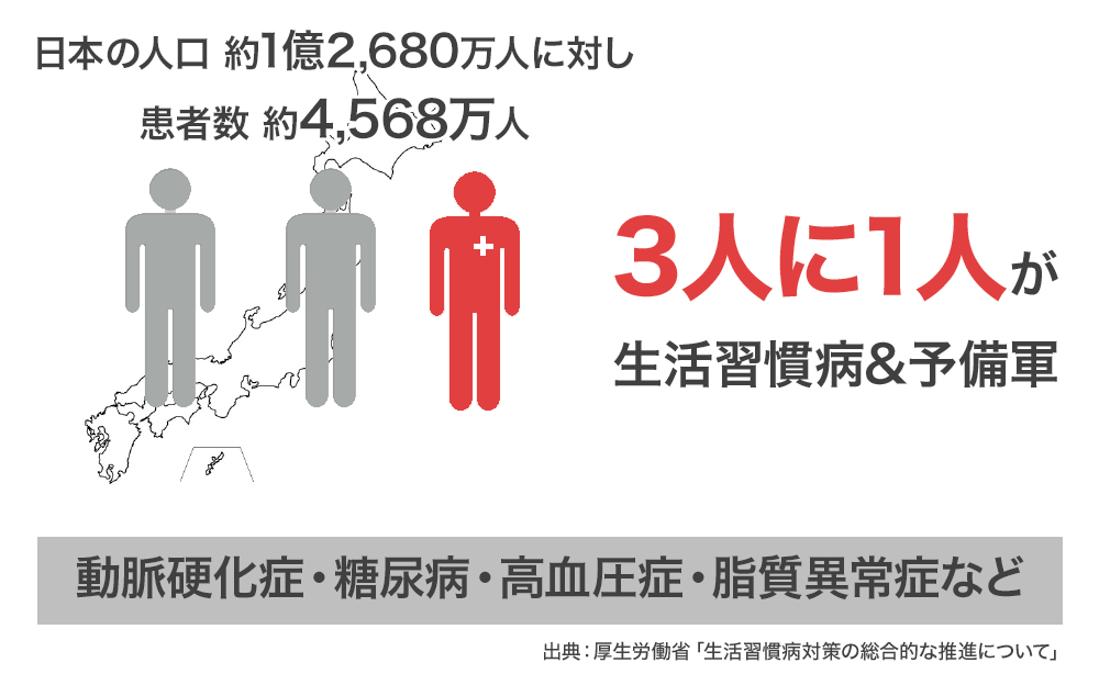 現在、日本には約4,568万人もの生活習慣病患者、またはその予備群がいると言われています。これは日本人口のおよそ3人に1人の割合です。