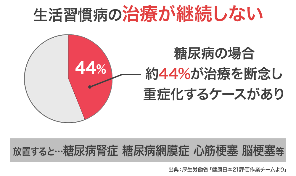例えば糖尿病の場合、最初の頃は通院しながら薬を服用していても、44%の方が途中で通院を止めてしまうというデータがあります。