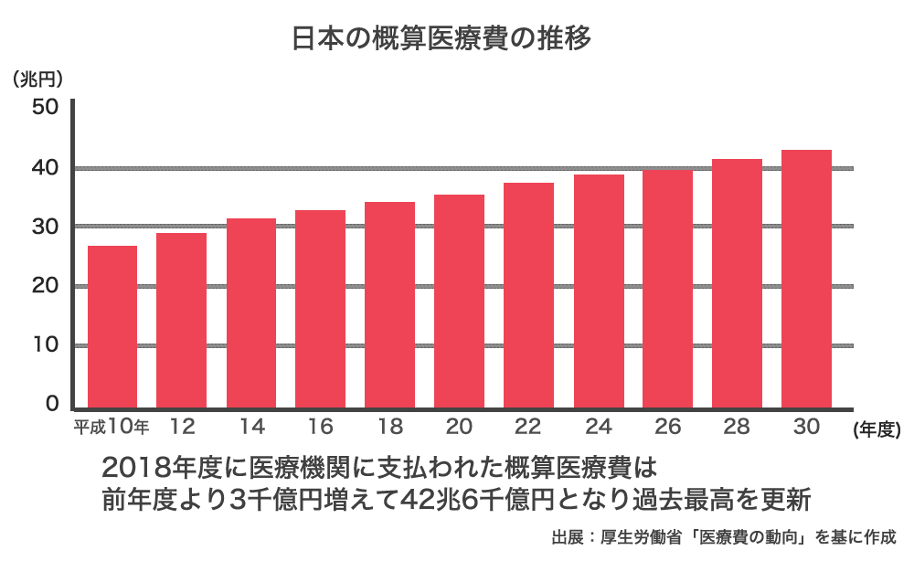 日本の医療費は高齢化の進行により、平成30年度に過去最高額となる42兆6千億円に達するなど増加の一途をたどっています。
