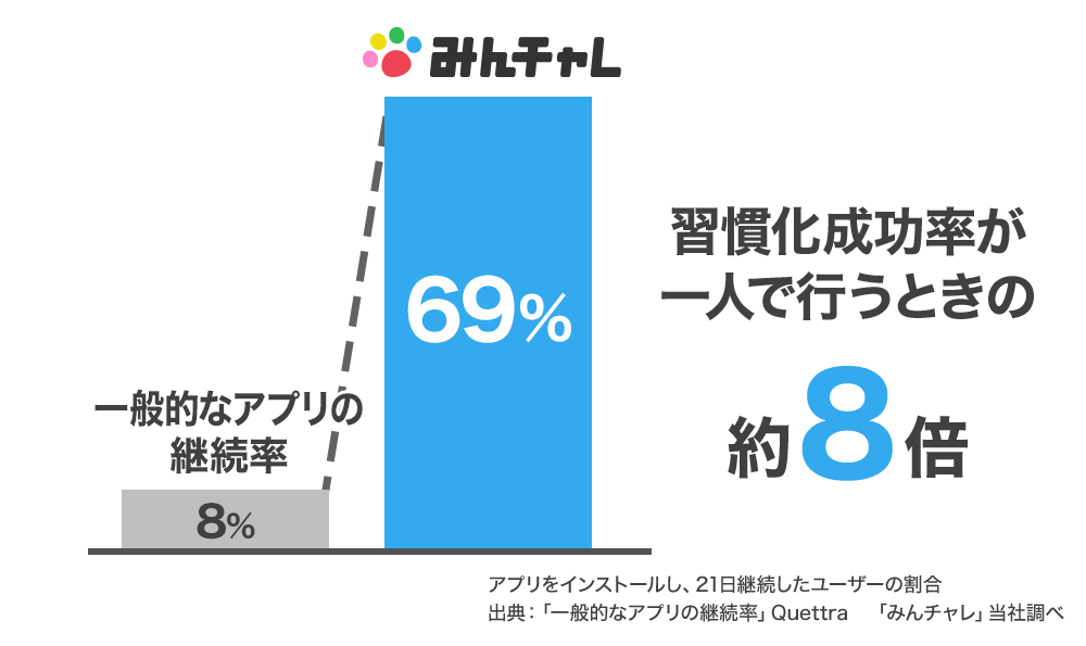 この仕組みにより「みんチャレ」はリリースしてから4年で、一人で取り組む場合の約8倍以上の習慣化成功率を達成しています。