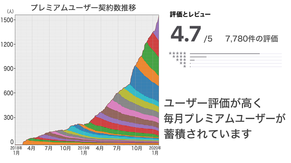 また、商標登録も済んでおり(第5835766号)国際特許も出願中で、Sony出身のエンジニアを中心とした優秀なメンバーがアプリを毎週バージョンアップしており、累計1,000回以上のアップデートを行ってきました。圧倒的な速さでアプリの改善を続け、他のアプリには真似できない優位性があります。