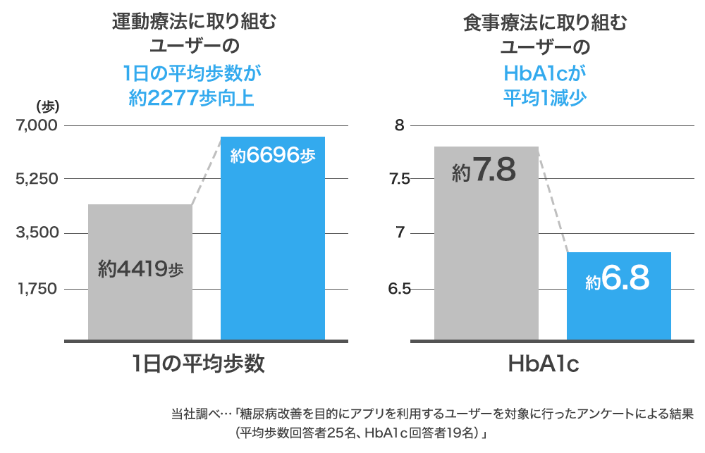 例えば、運動療法に取り組む糖尿病患者のチームでは、1日の平均歩数が2277歩向上し、HbA1cの値が平均1下がったという結果がでてきております。(当社調べの結果であり、効果やその数値には個人差があります。)