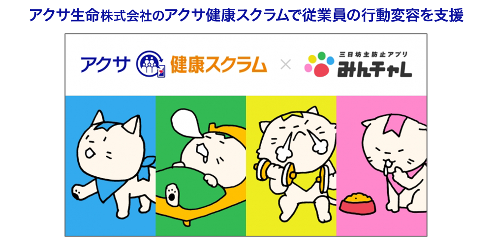 また2019年12月には企業の「健康経営」を支援する新たな試みとして、アクサ生命が提供する従業員向けの「健康経営サポートパッケージ」の“アクサ健康スクラム”の中で三日坊主防止アプリ「みんチャレ」が提供されました。