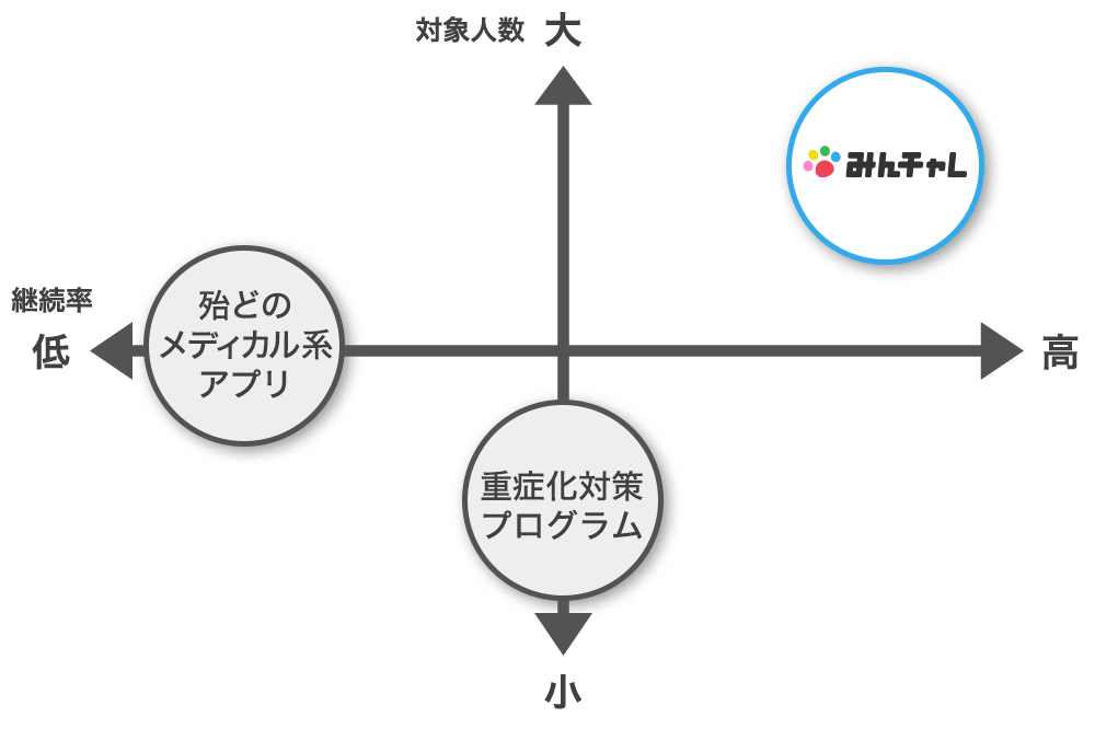 また、「みんチャレ」は個別の薬や医療機器、他のメディカル系アプリ、重症化対策プログラムと併用することができ、それぞれの効果を高めるポジションをとっており、汎用性が高いモデルです。