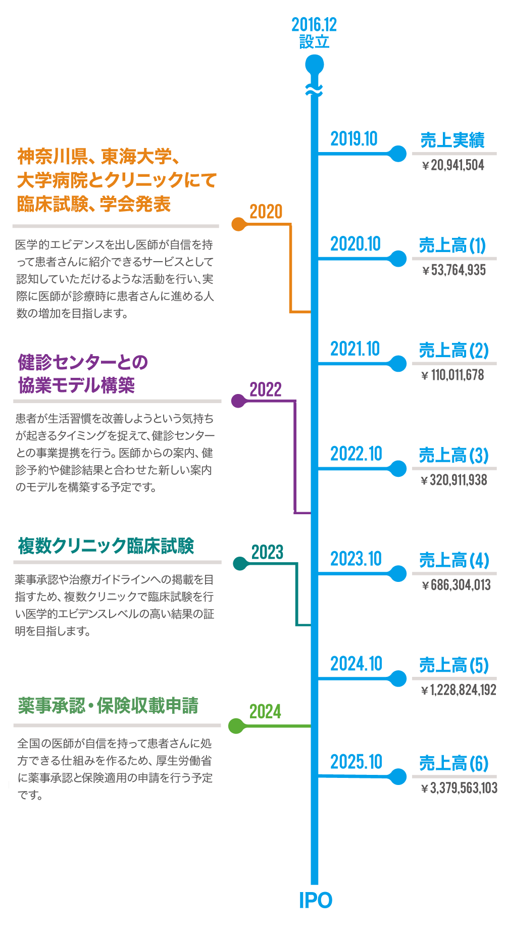下の表は現時点において今後の経営が事業計画通りに進展した場合のスケジュールです。そのため、今回の資金調達の可否、調達金額によって、スケジュールは変更となる場合がございますので、予めご了承ください。
