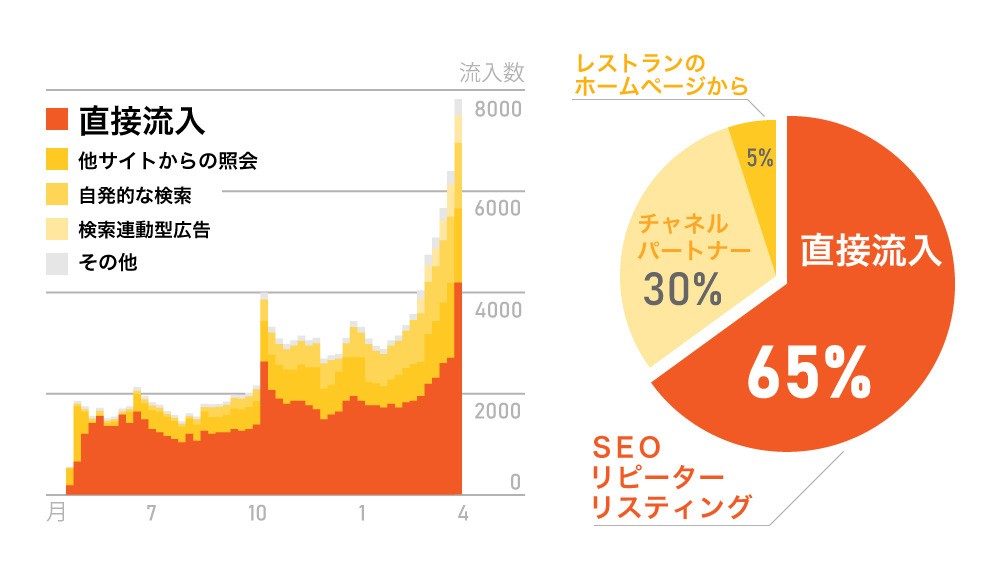 結果、ユーザーがダイレクトにサイトを訪れる導線が強化され、ユーザー獲得が加速されました。それにより、レストランのリクエスト件数は年々伸び、2019年は月に3,000件近くを安定的に獲得できました。