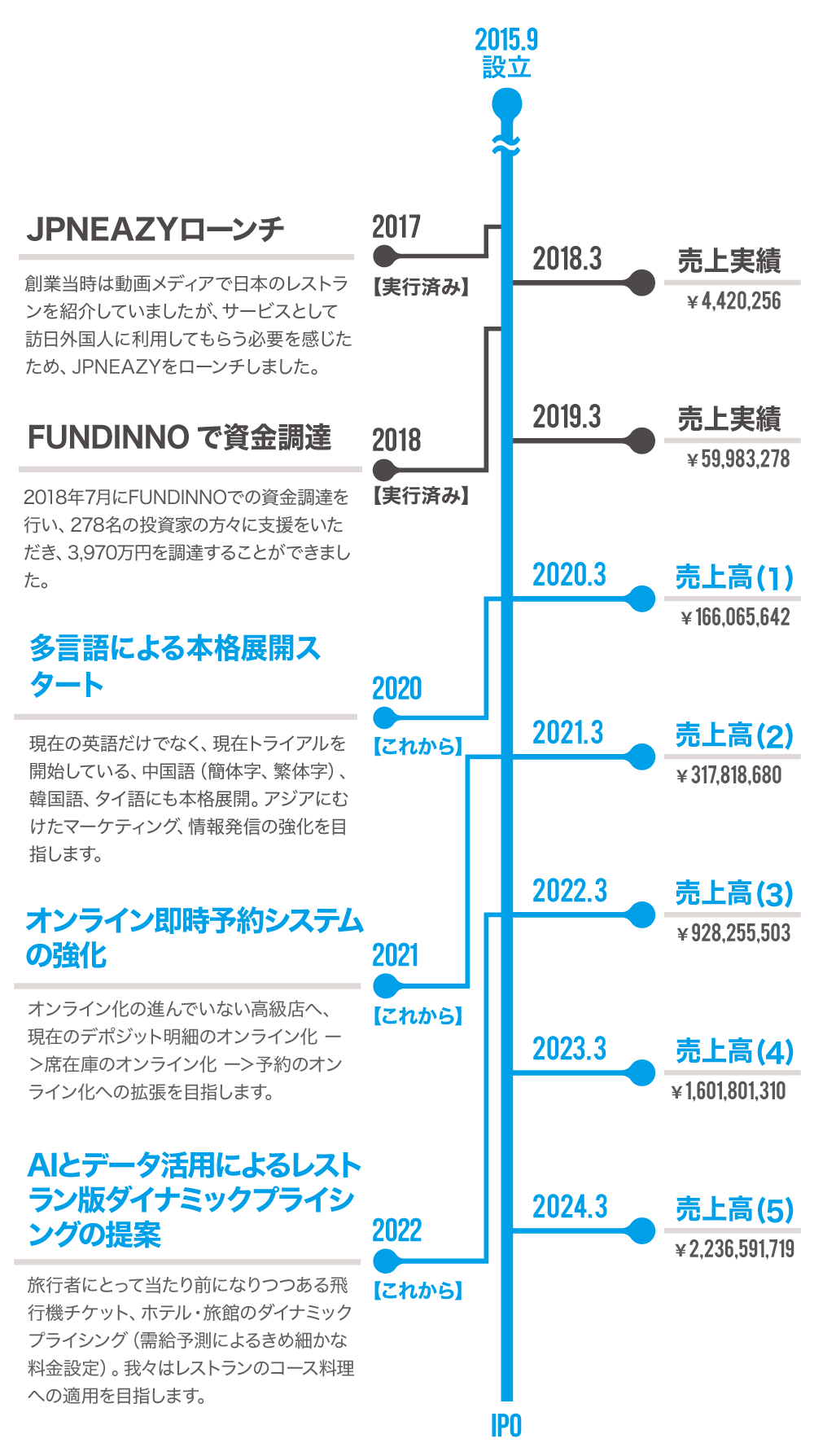 売上高は事業計画を前提としており、発行者の予想であるため、将来の株価及びIPO等を保証するものではありません。また、上記のサービス追加は、今回の資金調達に伴って行われるものではなく、今後、新たな資金調達を行うことによる追加を計画しているものです。なお、新たな資金調達の方法は現時点において未定です。