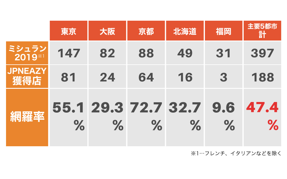 また、レストランの契約件数においても、前回の募集時には約100店舗でしたが、現在、270店舗まで拡大しました(2020年4月現在)。そして、日本の主要都市における契約ミシュランレストラン(和食関連)は、全体の約47%のシェアとなります。