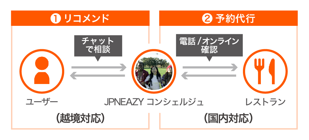 外国人の方の「行きたいお店が決まっていない」「予約ができない」といった問題に対し、コンシェルジュが「お店の提案」と「予約代行」をします。また、お店に代わって「JPNEAZY」のコンシェルジュが外国人とやり取りをすることで、双方が抱く言語や商習慣に対する物理的、心理的ギャップを埋めていきます。