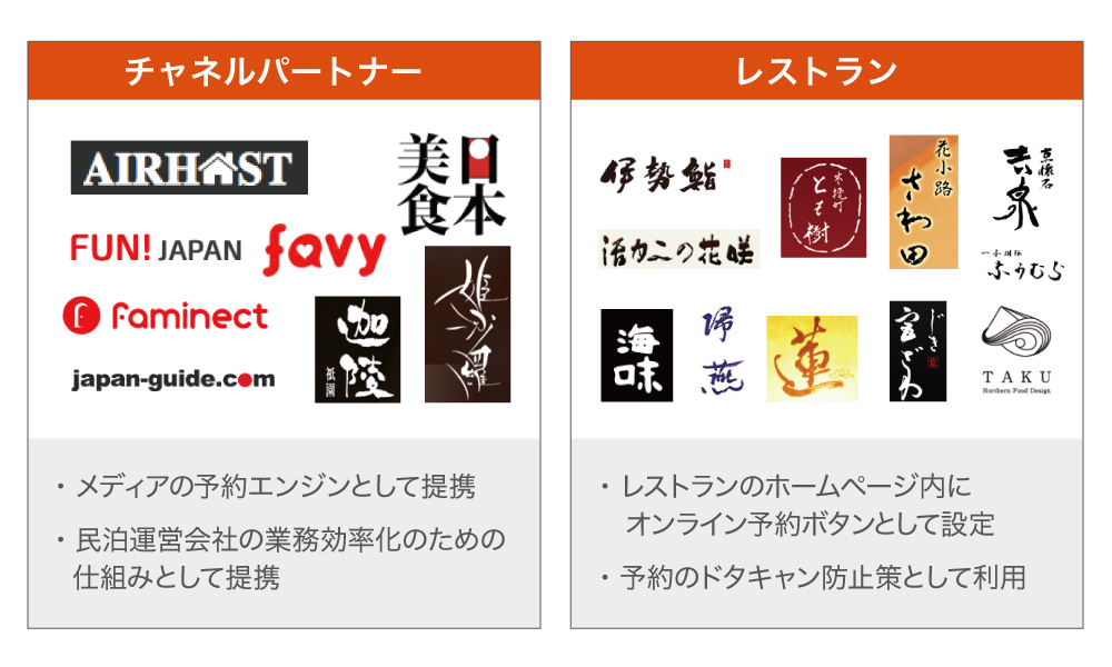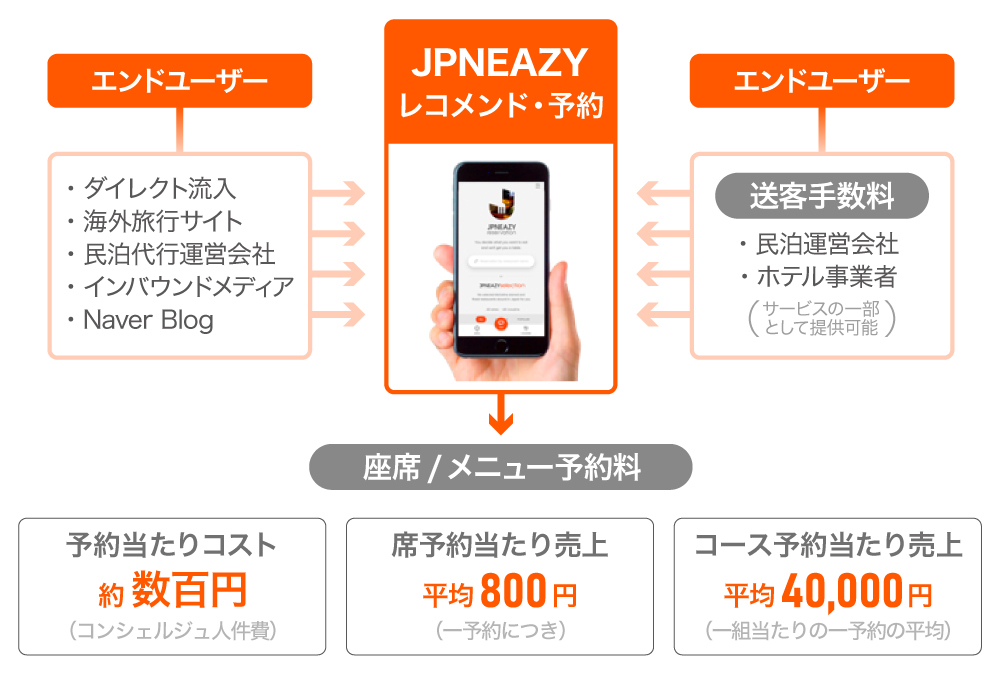 「JPNEAZY」では、高級店(主にミシュラン)をメインに、現在、270店舗と提携し、「オンライン予約」「事前決済」が可能です。また、大手民泊業者などのチャネルパートナーと連携し、旅行者に「日本の美味しいレストランをコンシェルジュが教えてくれるサイト」として認知していただいています。
