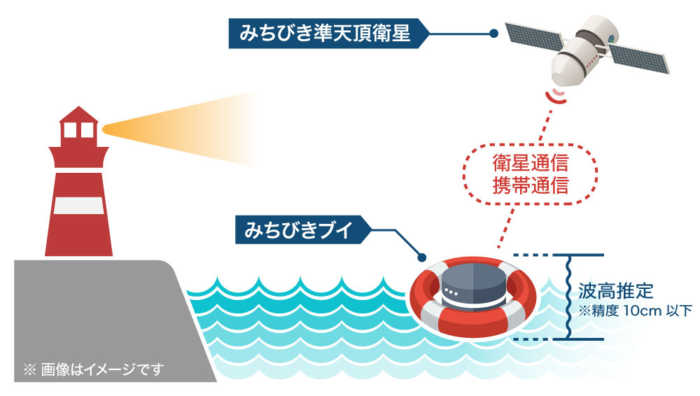 「みちびき海象ブイ」とは、みちびき準天頂衛星によって得られるGPSデータを活用した波高計測システムです。(「みちびき」について詳しくはこちら)