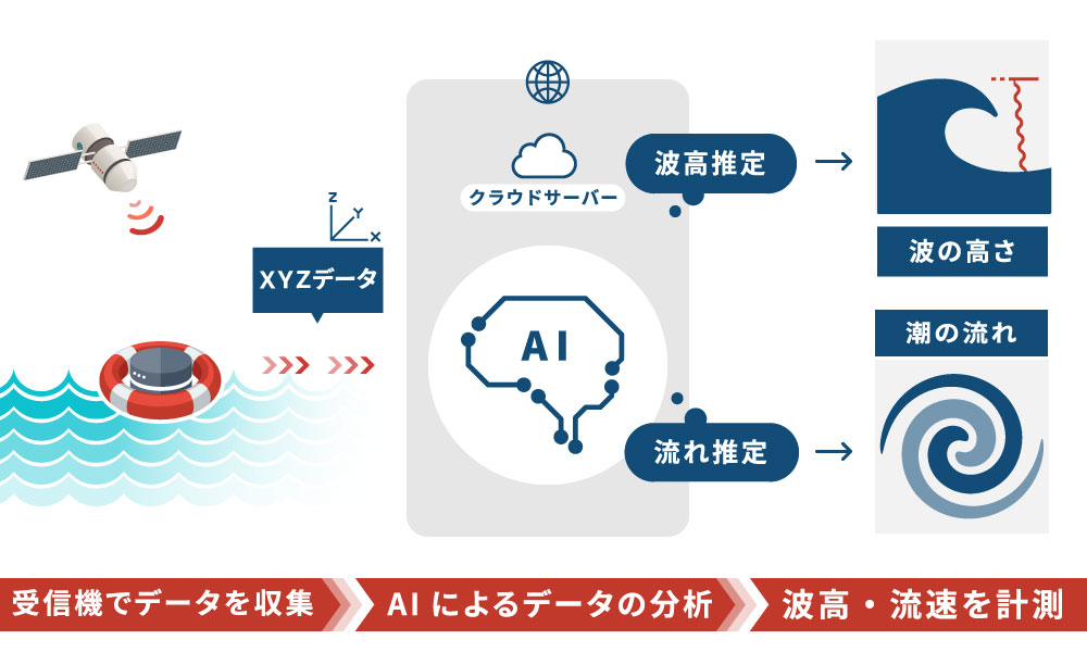 これを小型のブイ形状にして沖合に滞留させます。これにより、約30分間隔で波高・潮流のモニタリングを行うことができるようになりました。