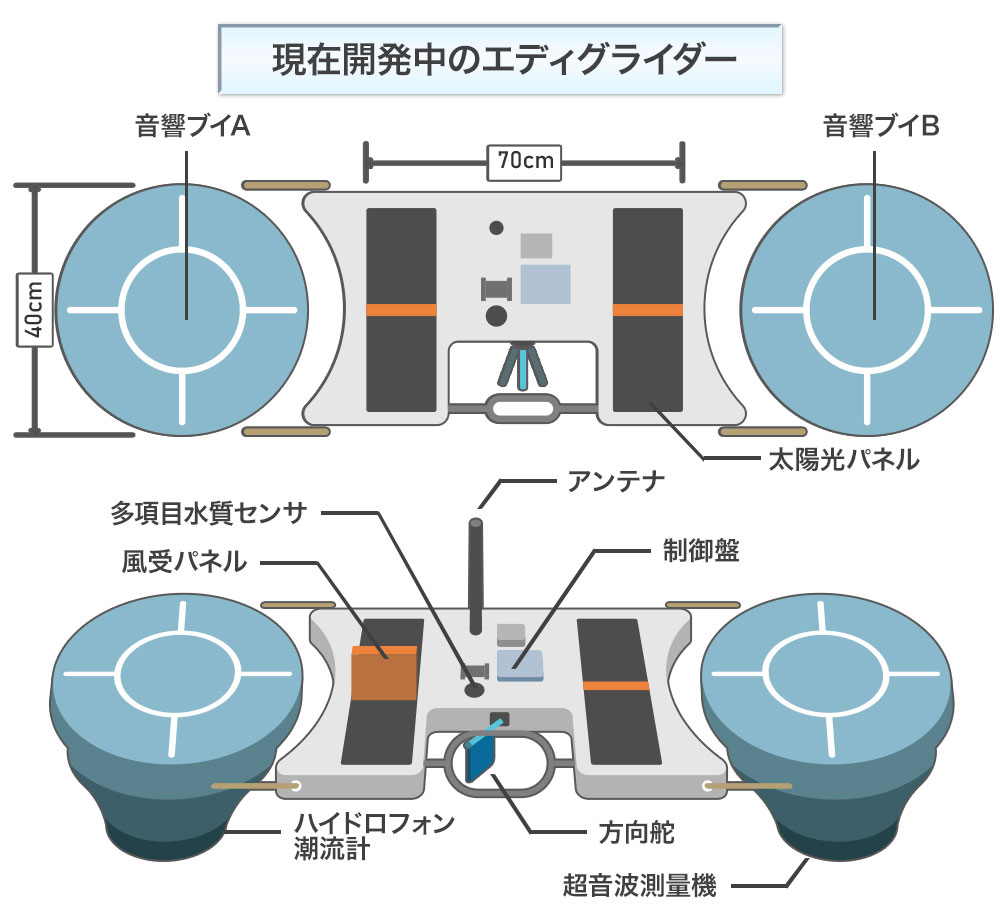 そして、将来的には波高だけでなく、沖合の海底地盤や潮流、水深なども漂流しながら調査できるみちびき海象ブイの進化系のロボット「エディグライダー」を開発し、より精度の高い情報取得を目指すのと、
