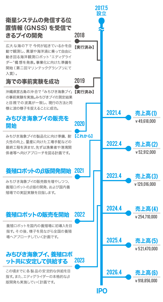 その後、弊社の計測装置を養殖業に活かした「AI養殖ロボット」や、「みちびき海象ブイ」をより進化させた「エディグライダー」の開発も併行していく計画です。