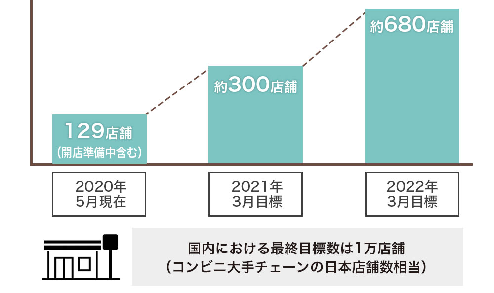 このような環境を整備していく為にも、弊社は2020年度中に契約ベースで300店舗(国内の最終目標は1万店舗)を展開していく計画です。