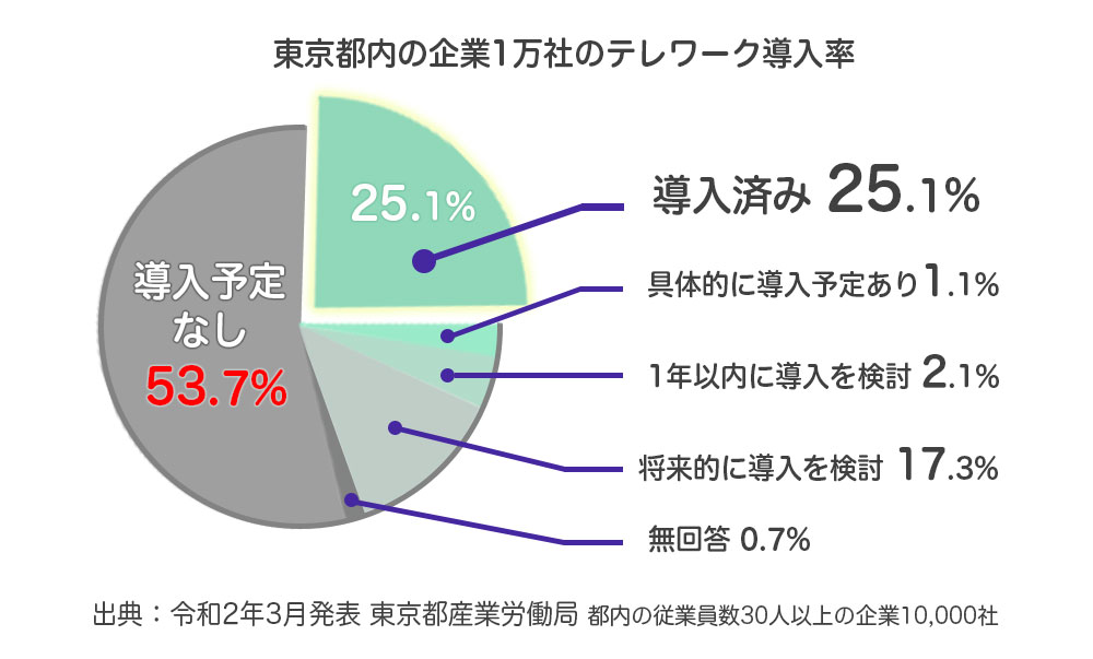 最近の新型コロナウィルス蔓延の影響もあり、2020年3月現在、東京都内でのテレワーク導入率は25%まで上昇したと言われています。(東京商工会議所発表2020/4/8)