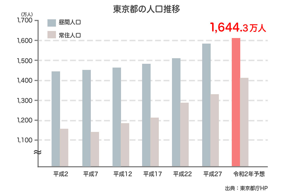 日本は旧来から都心にオフィスが集中してきました。特に、東京の日中人口密集率は年々増加する一方です。(東京都HPより)