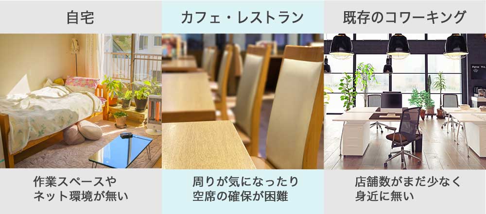 また、自宅以外の場所として、カフェやコワーキングルーム等の共有スペースがあります。しかし、カフェだと辺りが気になったり、空席の無いこともあると思います。また、コワーキングスペースの数は増えつつありますが、これは現在オフィスが密集している都心部が主な展開エリアとなり、居住地への浸透はあまり進んでいません。(自社調査による)