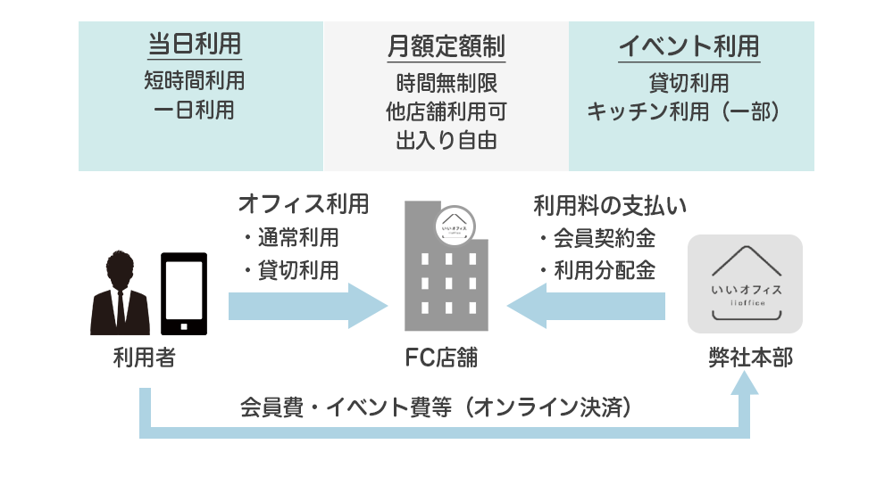 それにより、契約した企業の従業員は、自宅から近い「いいオフィス」全店を自由に使える仕組みを構築しております。
