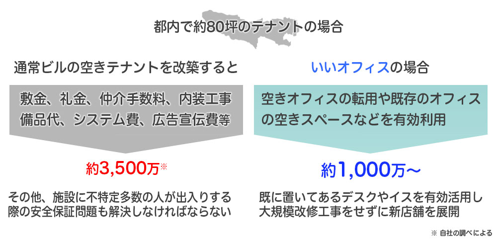 弊社の競合優位性は、店舗を展開する速さと場所です。通常なら、何もない建物からコワーキングを出店すると、80坪に対して約3,500万円の費用がかかります。(当社による概算)