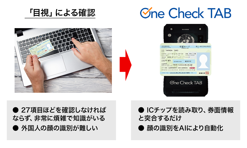 弊社は、在留カード内の「ICチップ」を読み取ることで、カードの券面情報とカード内の情報が正しいかを判別可能なシステム「OneCheckTAB」を開発しました。